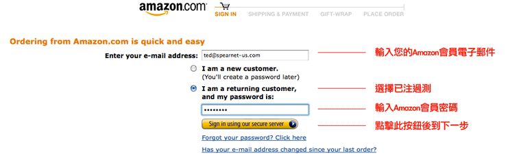 選擇 " I am a returning customer, and my password is:" 然後輸入Amazon會員密碼